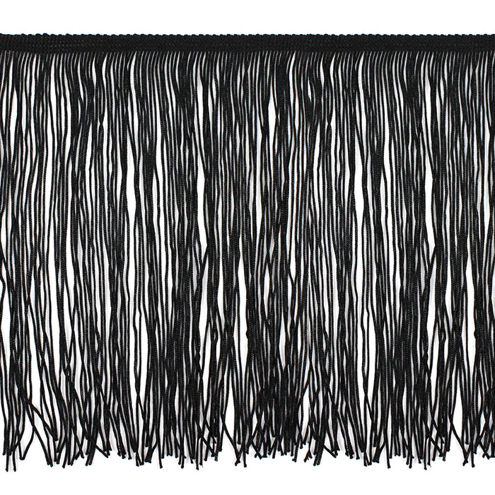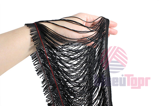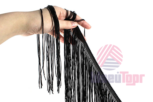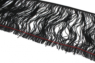 Бахрома доступна в черном цвете. Она идеально подходит для отделки одежды, декора сценических костюмов, а также для украшения головных уборов и элементов интерьера. Представляет собой прочную, плетёную декоративную тесьму с ниспадающими синтетическими нитями. Длина нитей – 20 см.