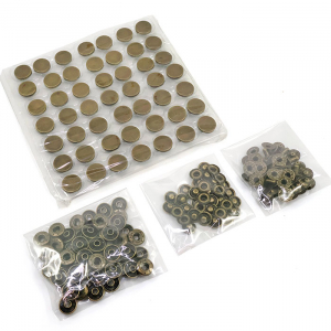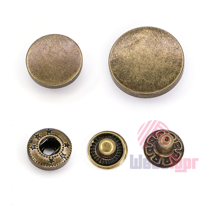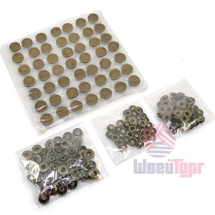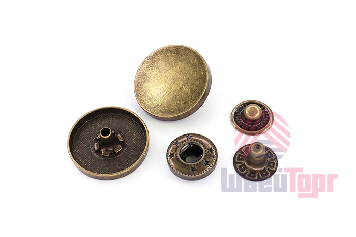 Металлические установочные кнопки системы "Альфа", состоящие из 4 частей. Установка кнопок на одежду производится с помощью пресса и специальных насадок.