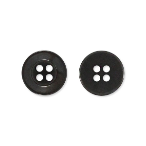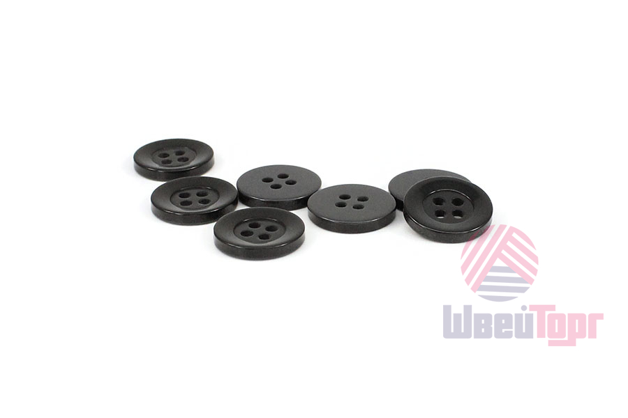 Пластиковые брючные пуговицы на четыре прокола. Лицевую сторону пуговиц окаймляет плоское кольцо шириной 3 мм и небольшое углубление, что придаёт им особый характер. У пуговиц тёмно-серый цвет, с лёгким мерцанием, что придаёт им ещё более привлекательный вид.