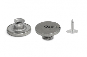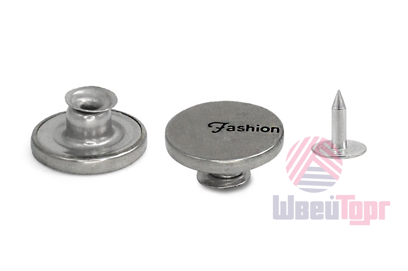 Стильная металлическая пуговица, представлена в двух вариантах – матовый никель (однотонная) и матовый никель (с контрастной тёмной надписью). Пуговица имеет плоскую форму и минималистичный декор в виде небольшой гравировки "Fashion". Эта пуговица станет стильным завершающим штрихом для ваших изделий из джинсы, будь то джинсы, джинсовые шорты или джинсовые куртки. В комплект входят надёжные гвоздики для крепления.