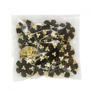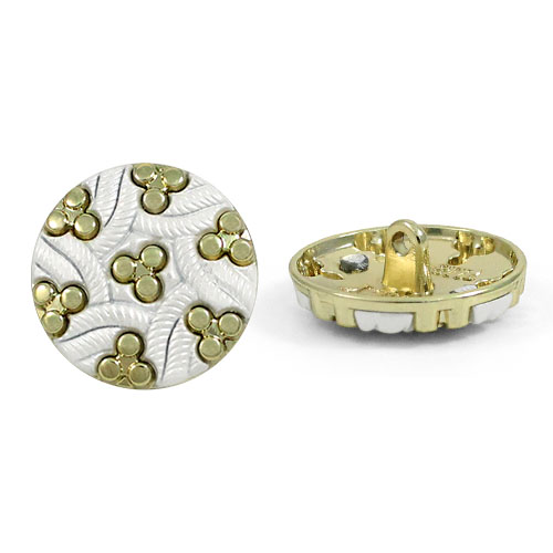 Эта металлическая пуговица на ножке приятно удивляет своим малым весом, сочетающимся с ощутимой прочностью. Её главная особенность – выразительный декор: фактурные переплетающиеся элементы из чёрного пластика контрастируют с яркими золотистыми вставками, создавая динамичный и запоминающийся облик.