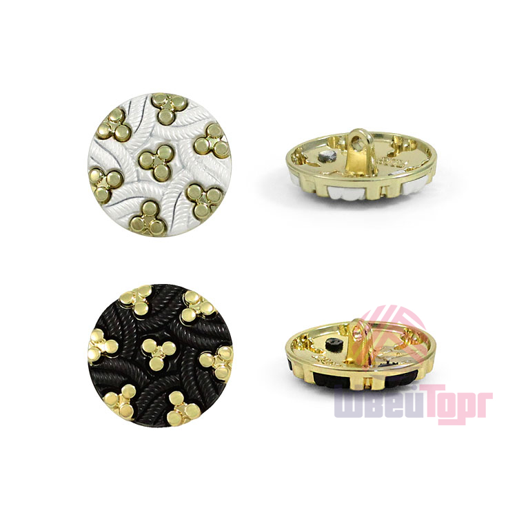 Эта металлическая пуговица на ножке приятно удивляет своим малым весом, сочетающимся с ощутимой прочностью. Её главная особенность – выразительный декор: фактурные переплетающиеся элементы из чёрного пластика контрастируют с яркими золотистыми вставками, создавая динамичный и запоминающийся облик.