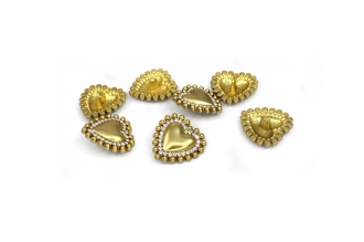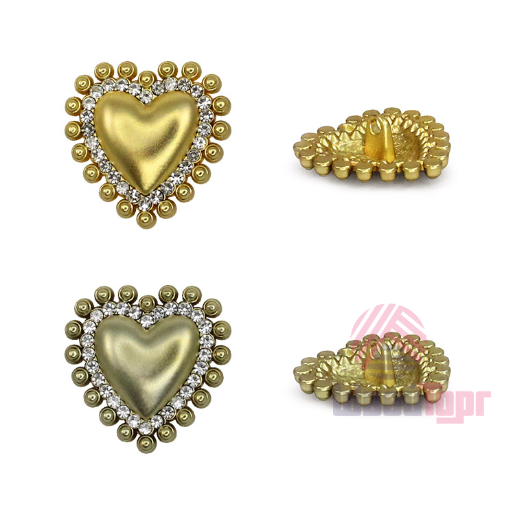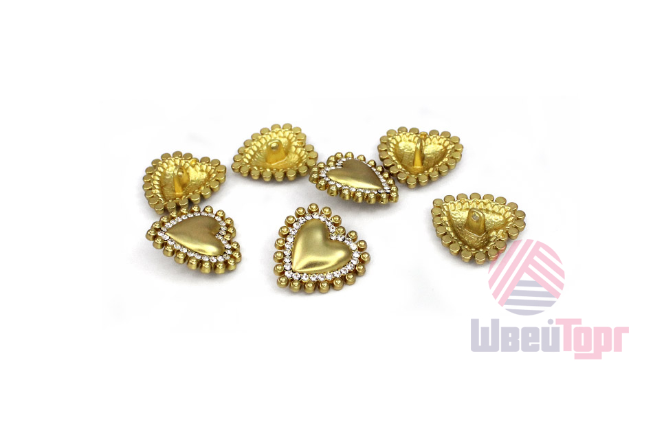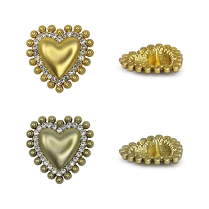 Металлическая пуговица на ножке станет изысканным акцентом вашего наряда благодаря оригинальной форме выпуклого сердечка, украшенного двумя уровнями декора: внутреннее обрамление из сияющих страз и внешний контур из филигранных металлических «бусин». Эта сверкающая деталь идеально дополнит вечерний костюм, жакет или платье, создавая праздничный образ, а выбор между оттенками яркого и тёмного матового золота позволит подобрать идеальное сочетание для любой ткани.