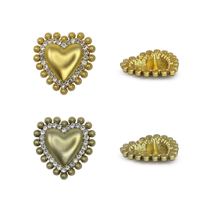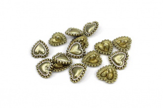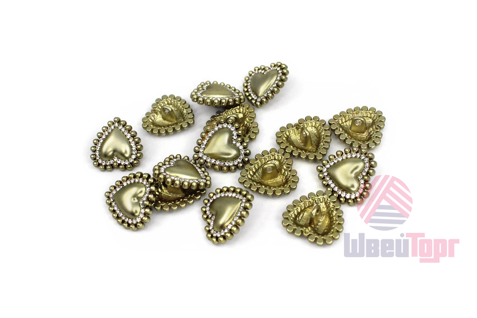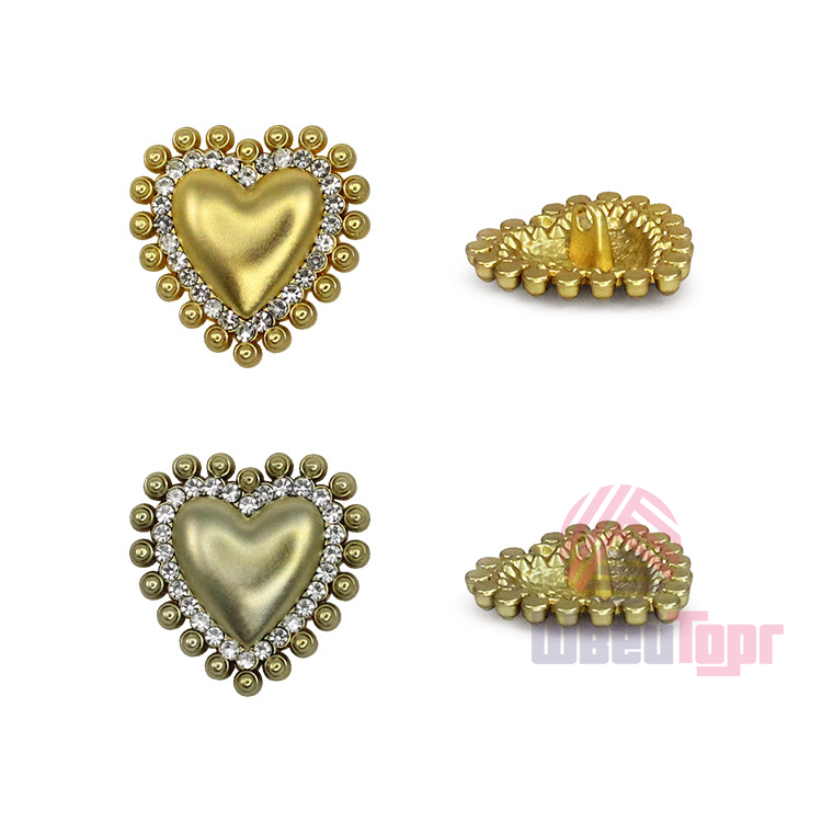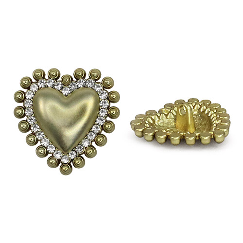 Металлическая пуговица на ножке станет изысканным акцентом вашего наряда благодаря оригинальной форме выпуклого сердечка, украшенного двумя уровнями декора: внутреннее обрамление из сияющих страз и внешний контур из филигранных металлических «бусин». Эта сверкающая деталь идеально дополнит вечерний костюм, блузу, жакет или платье, создавая праздничный образ, а выбор между оттенками яркого и тёмного матового золота позволит подобрать идеальное сочетание для любой ткани.