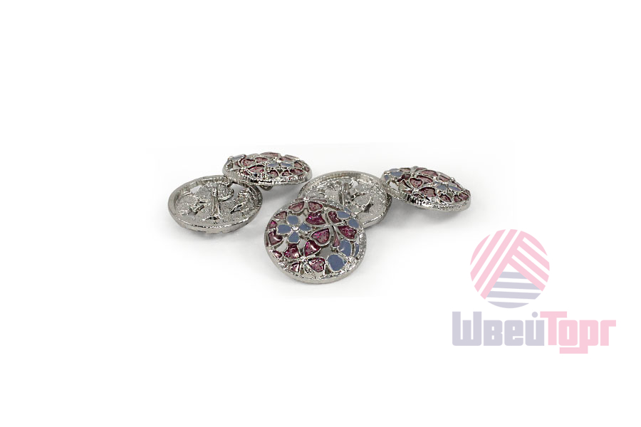 Позвольте вашему наряду расцвести! Эта металлическая пуговица напоминает драгоценную миниатюру. Её сложный, резной дизайн завораживает: основа из серебристого металла подобно кружевной ленте обрамляет нежный букет. Ажурная резьба, образующая букет из голубых и пурпурных соцветий, и лёгкое сияние блёсток делают их маленьким шедевром.