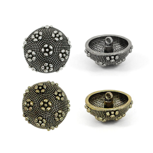 Пуговица доступна в двух цветах – чернённый и антик – оба варианта выгодно подчёркивают рельефную поверхность и добавляют пуговице нотку роскоши. Прочная ножка обеспечивает удобное пришивание, а необычный дизайн делает эту пуговицу настоящим акцентом в любом образе. Данные пуговицы прекрасно подойдут для ваших костюмов и жакетов.