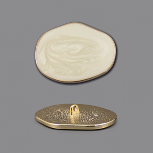 Эти металлические пуговицы на ножке сочетают в себе прочную основу и лицевую вставку из акрила, окаймлённую тонким металлическим ободком. У пуговиц уникальная, плавная асимметричная форма, которая придаёт минималистичному дизайну оригинальный и стильный характер. Перламутровые разводы с мерцающими блёстками создают изысканную игру света.