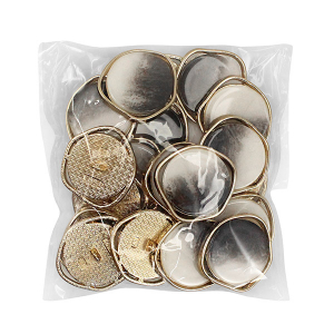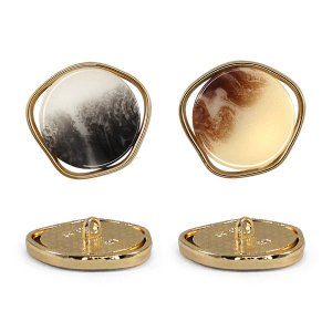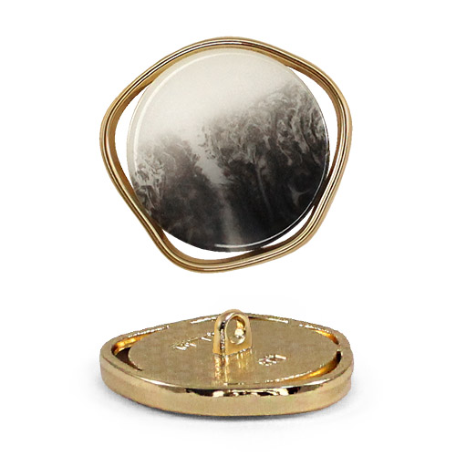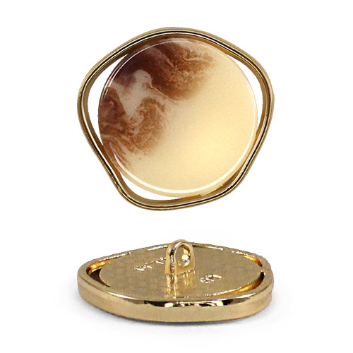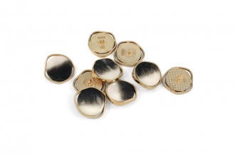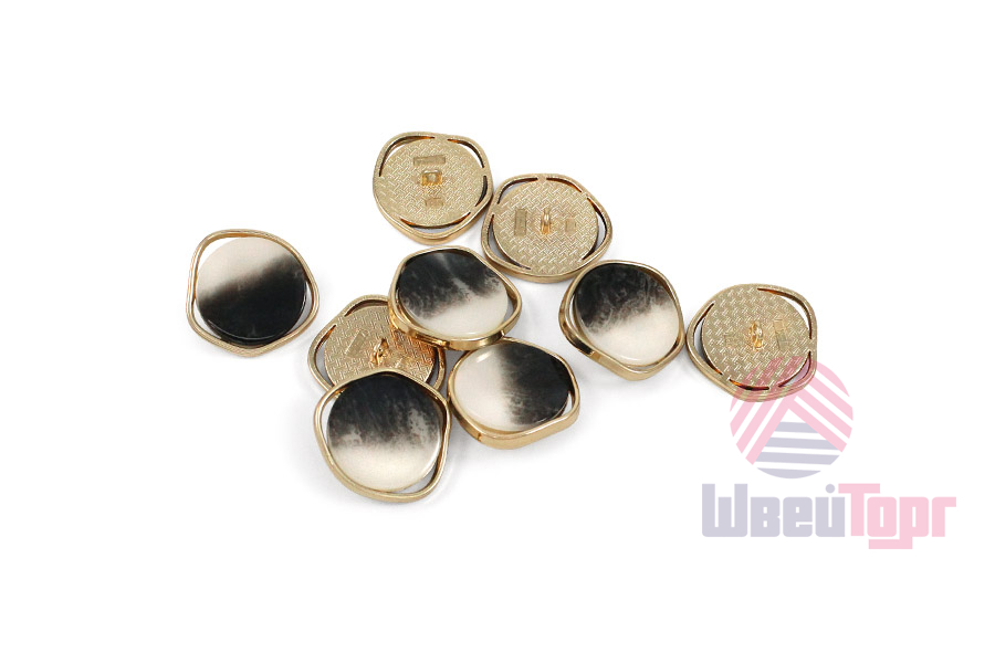 Пуговица на ножке для создания минималистичного и стильного образа. Пуговица собрана из двух частей – золотистая металлическая основа и лицевая часть с лёгким глянцем и интересным окрасом в виде разводов. Пуговица представлена в трёх вариантах расцветки: чёрный/кремовый/золото, белый/золото и бежевый/золото. Сдержанный и интересный элемент для оригинального образа.
