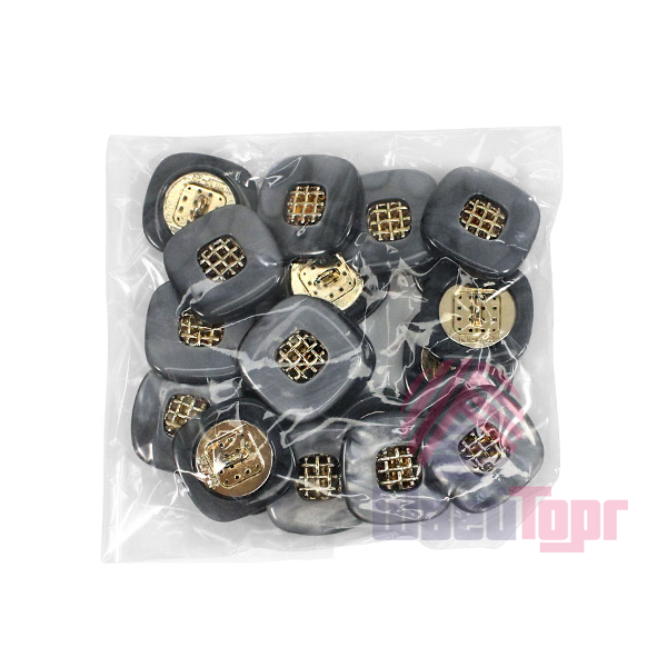 Эта пуговица из пластика с лёгким перламутровым эффектом привлечёт внимание изящной деталью: в центре квадрата, с мягко скруглёнными углами, расположена изысканная золотая решётчатая вставка.