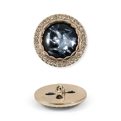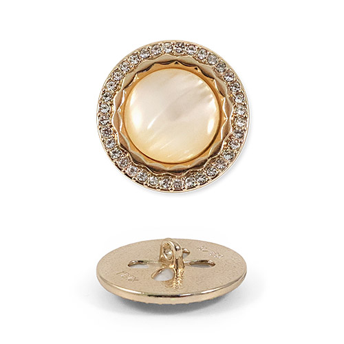Эта металлическая пуговица диаметром 22 мм на удобной ножке, станет яркой деталью для вашего жакета или костюма. Её золотистая основа по краю украшена россыпью мелких стразов, а центральная выпуклая вставка из акрила, переливающаяся перламутром, добавляет объём и игру света.