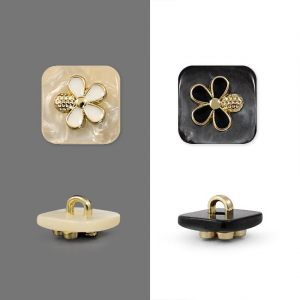 Пластиковая пуговица на ножке для создания милого и стильного образа. Пуговица имеет привлекательный дизайн – глянцевая, перламутровая основа с эффектом разводов, которую украшает объёмный металлический элемент, в центральной части, в виде цветка. Оригинальный элемент для яркого образа. Пуговица представлена в двух цветах: чёрный и нежный кремовый.
