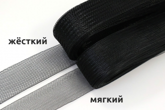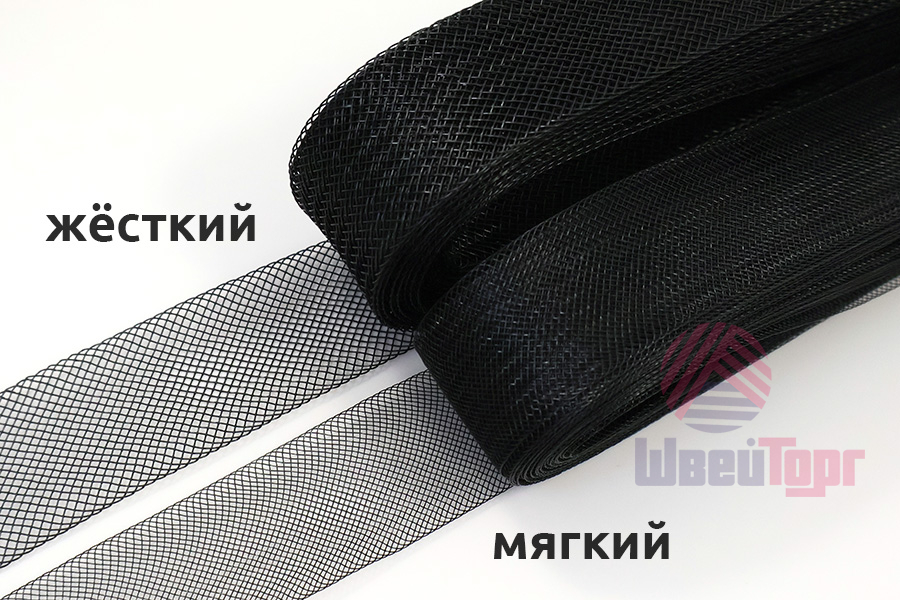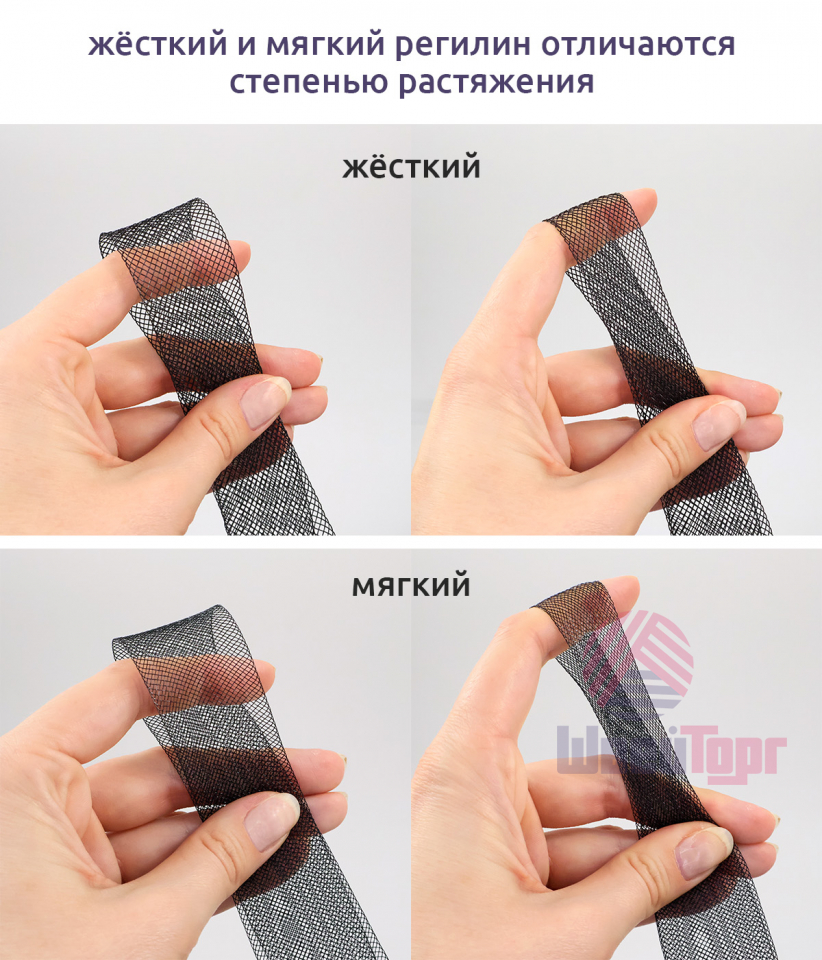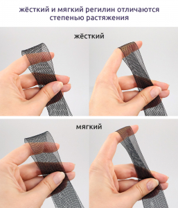 Жёсткий сетчатый регилин в отличие от мягкого менее эластичен, лучше держит форму даже без основы и используется главным образом в каркасах для костюмов.