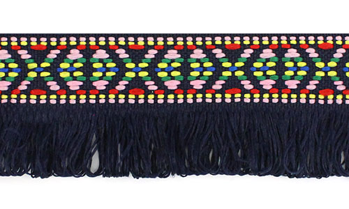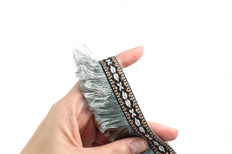 Ширина тесьмы 4 см, а сочетание орнамента и бахромы создают динамику, идеально подходящую для украшения одежды в стиле бохо, создания ярких аксессуаров или декора интерьера.