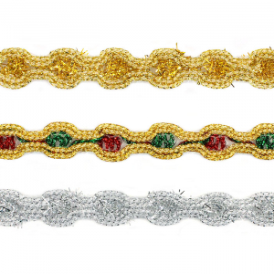 Тесьма доступна в трёх цветах: золото, серебро и золото/красный/зелёный. Она идеально подходит для отделки одежды, декора сценических костюмов, а также для украшения головных уборов и элементов интерьера. Представляет собой прочную плетёную, рельефную тесьму с повторяющимся геометрическим узором. Тесьма пронизана металлизированными нитями, что придаёт ей уникальный блеск. Создавайте свои неповторимые изделия!