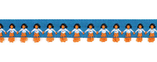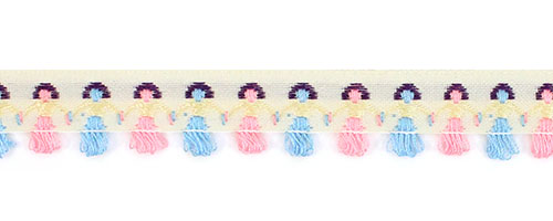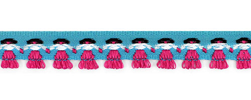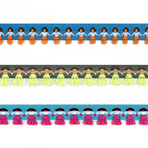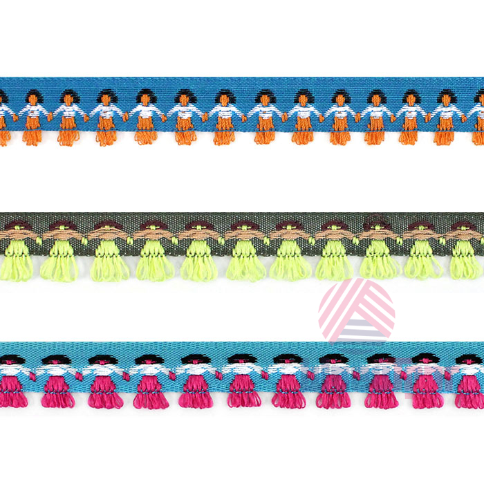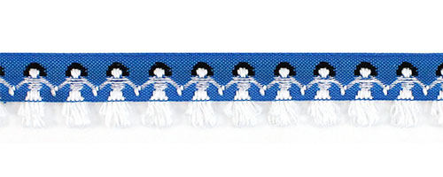 Данная тесьма с узором станет акцентной декоративной отделкой для разнообразных проектов, от скрапбукинга до пошива национальных и сценических костюмов. У тесьмы оригинальный дизайн в виде стилизованных фигурок, держащихся за ручки.