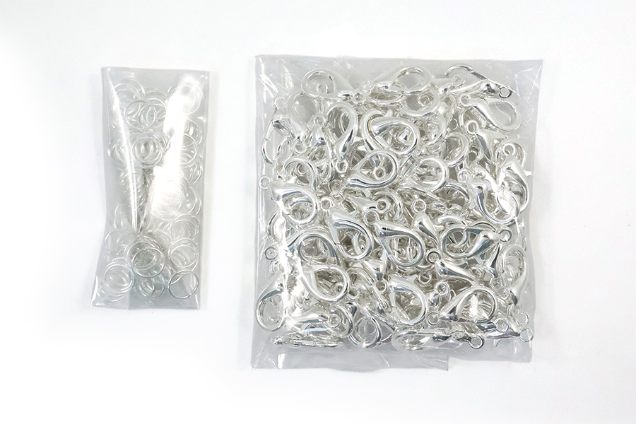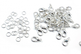 Практичная застёжка для бижутерии в цвете серебро. В комплект входят две части: удобный карабин и разжимное кольцо для регулировки длины. Простая и надёжная фиксация. Прекрасно подойдёт для бус, чокеров, браслетов и других изделий.